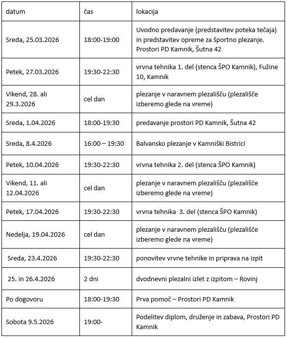 V ceno je vključena uporaba stene PD Kamnik in plačilo inštruktorjev ter 3x vstopnico za plezanje na plezalni steni PD Kamnik po končanem tečaju.
